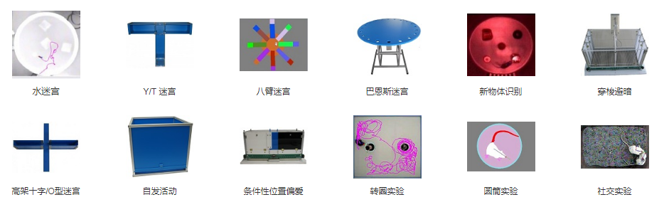 该系统可完成水迷宫,Y迷宫,八臂(辐射)迷宫,巴恩斯迷宫,高架十字迷宫,高架O型迷宫,自发活动实验,新物体识别实验,穿梭避暗实验,条件性位置偏爱实验,转圈实验,圆筒实验等各项常规动物行为学实验,还有专门用于恐惧抑郁、社会交互模块的软件。
